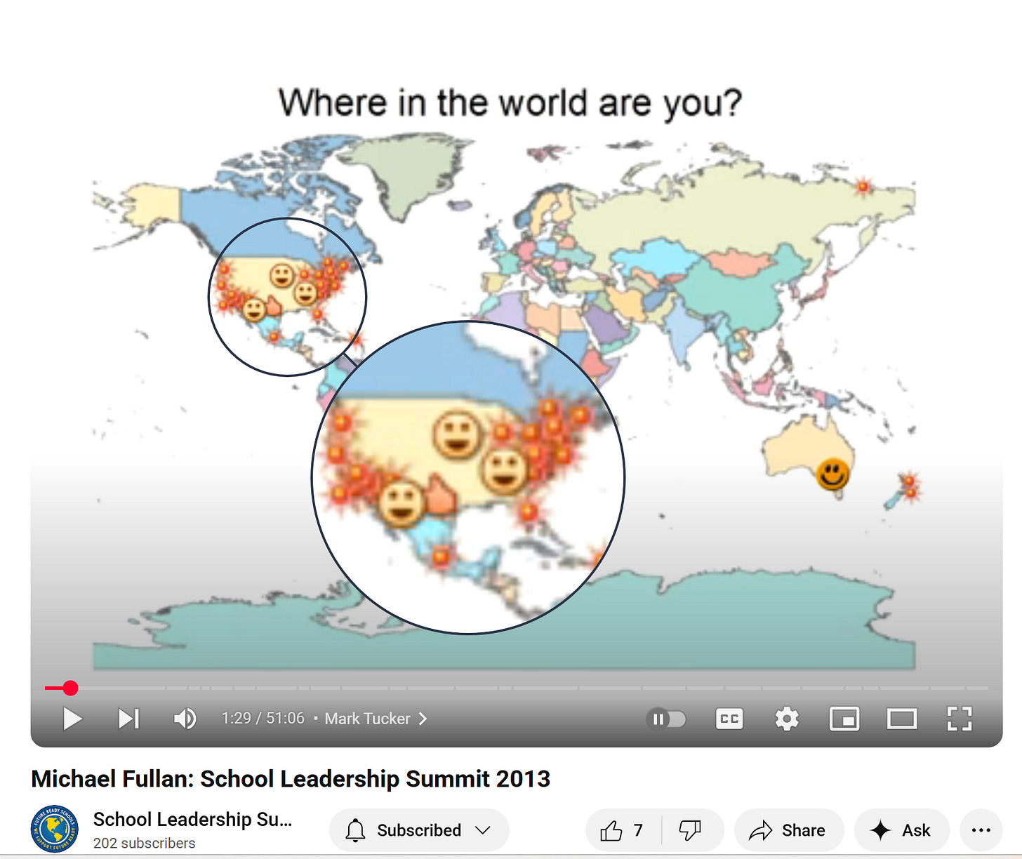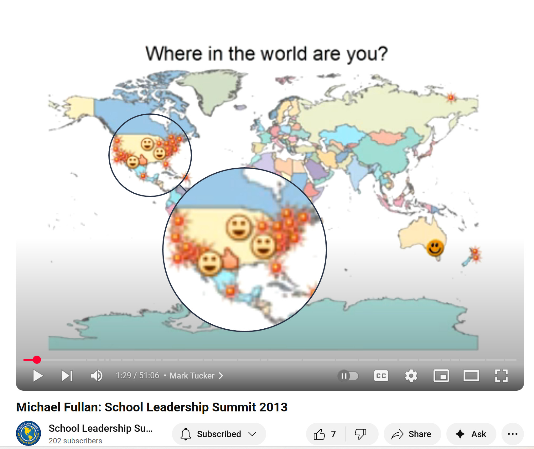 Photo above: Michael Fullan’s NPDL system has been adopted around the globe. This is from a training 2013. The stars and emojis represent school administrators. The system has grown exponentially since 2013.