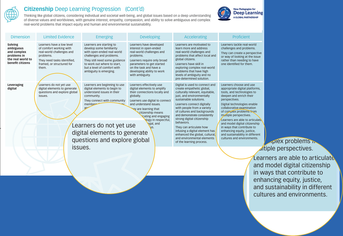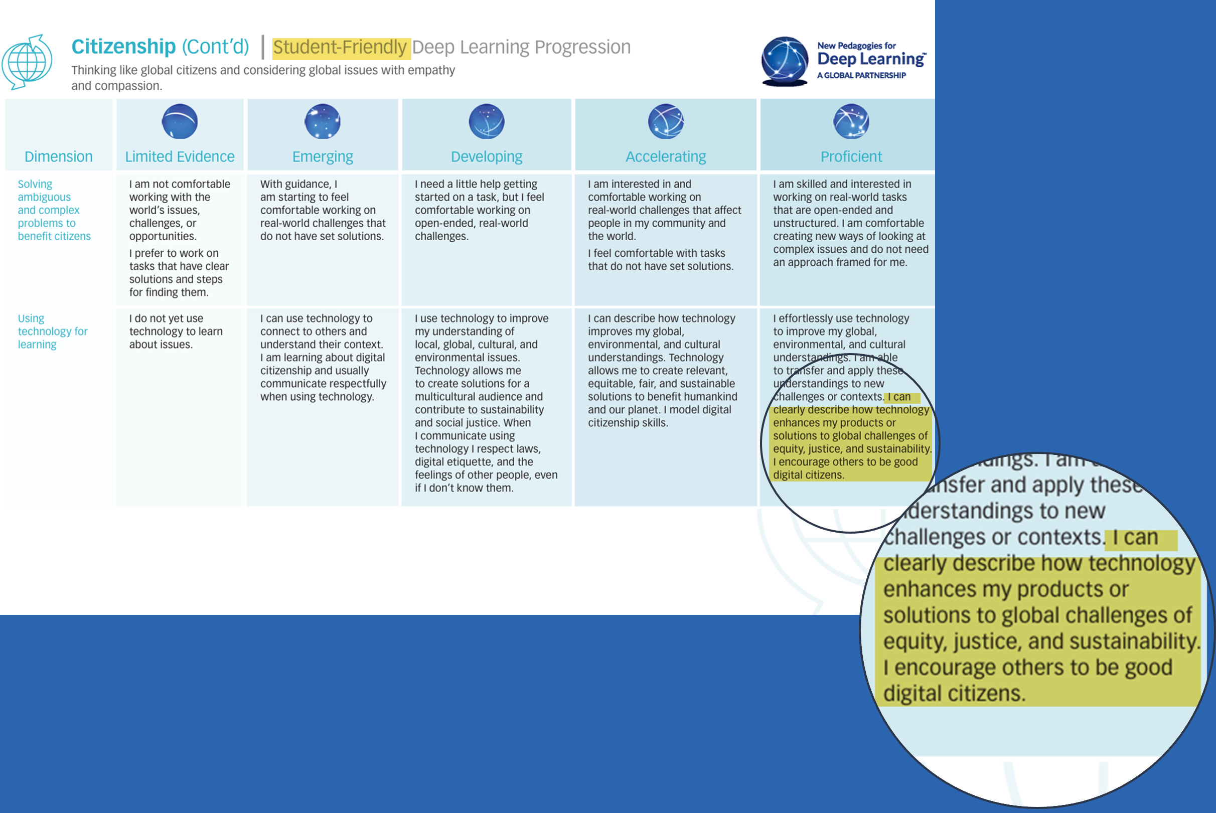 In training material, Michael Fullan’s New Pedagogies for Deep Learning (NPDL) framework explain that these tools “provide a description of the dimensions for each of the 6 C’s and possible pathways for student progress.” Educators can assess a child’s strengths and needs, then design learning activities to address those needs, monitor the student’s progress, and evaluate their development over time.